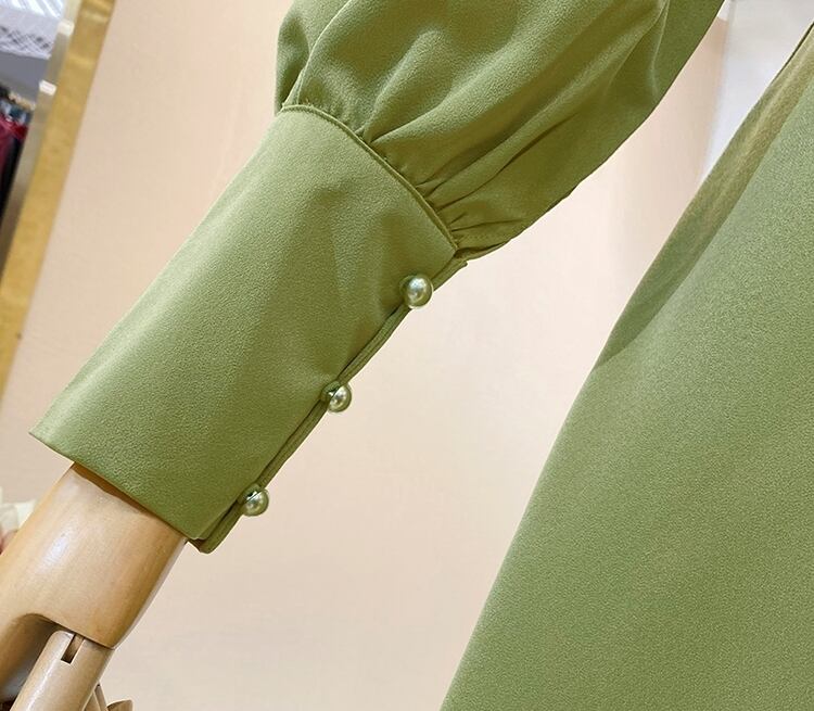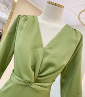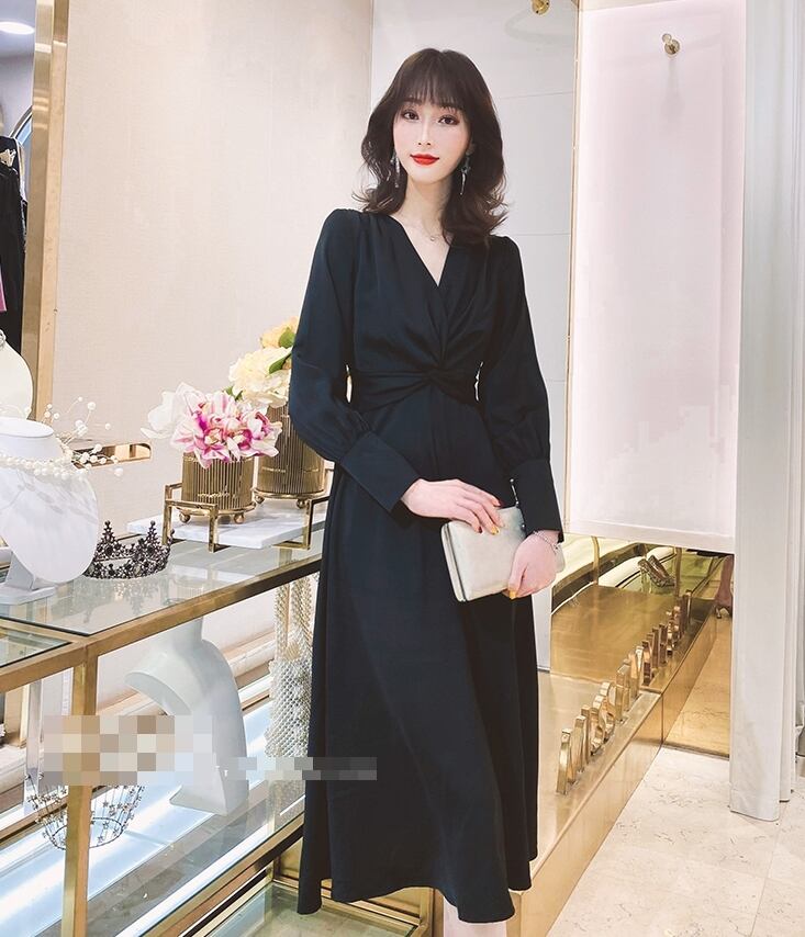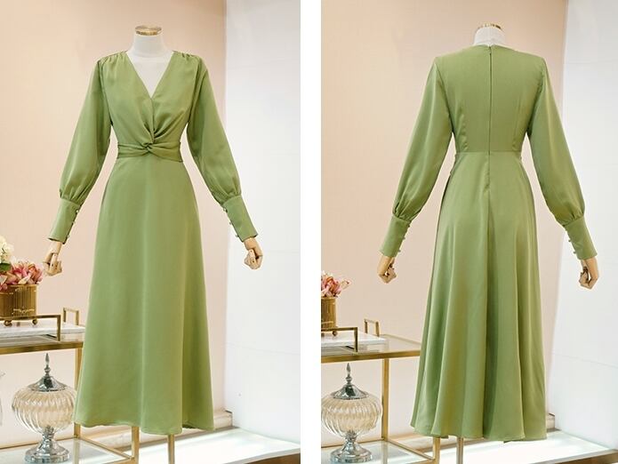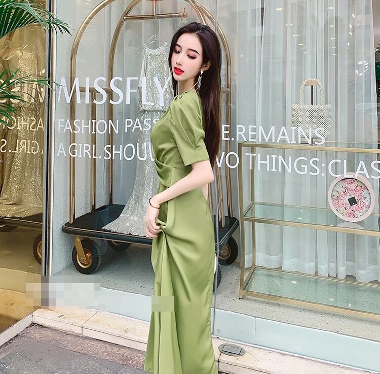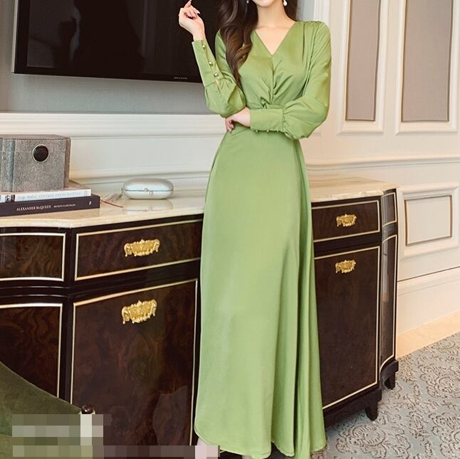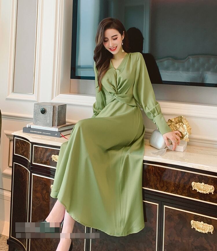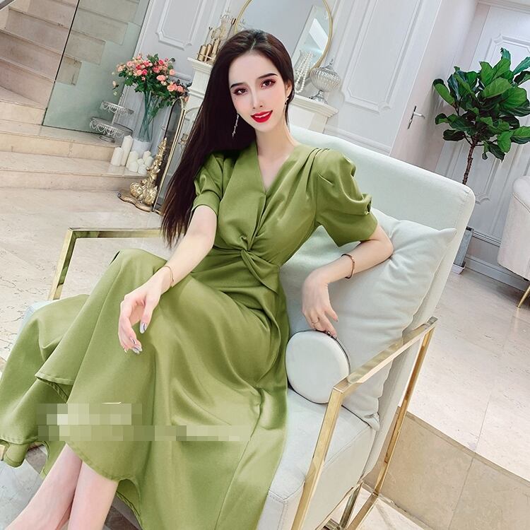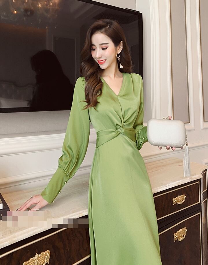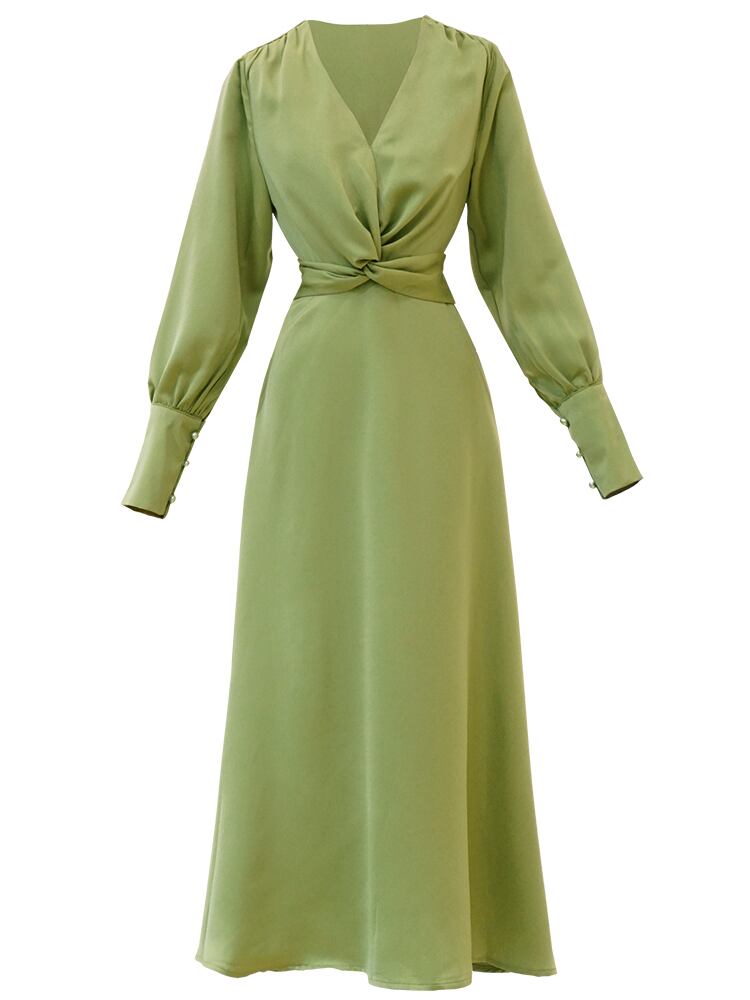 全2色 2種 ワンピース ミモレ丈 長袖 半袖 Vネック フロント結び 上品 カジュアル きれいめ 大人 とろみ素材 お呼ばれ 光沢 デート 女子会 秋