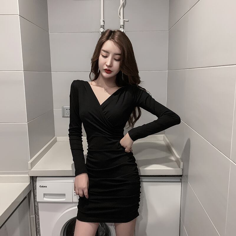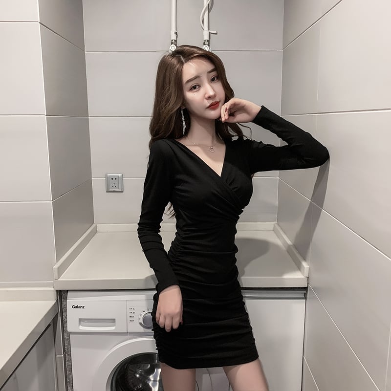 全2色 ワンピース ミニ丈 タイト Vネック カシュクールネック シンプル 長袖 セクシー 大人 カジュアル きれいめ お出かけ スリム デート 女子会 秋 冬
