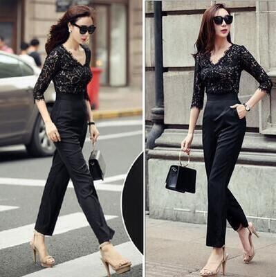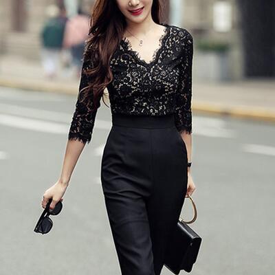 オールインワン レディース サロペット パンツ 秋冬 おしゃれ ジャンプスーツ パンツドレス レース Vネック 7分袖 透け感 アンクル丈 9分丈 きれいめ シンプル レトロ お出かけ デート お呼ばれ パーティ 結婚式 二次会 ブラック 大きいサイズ XL 2XL 20代 30代 40代 50代