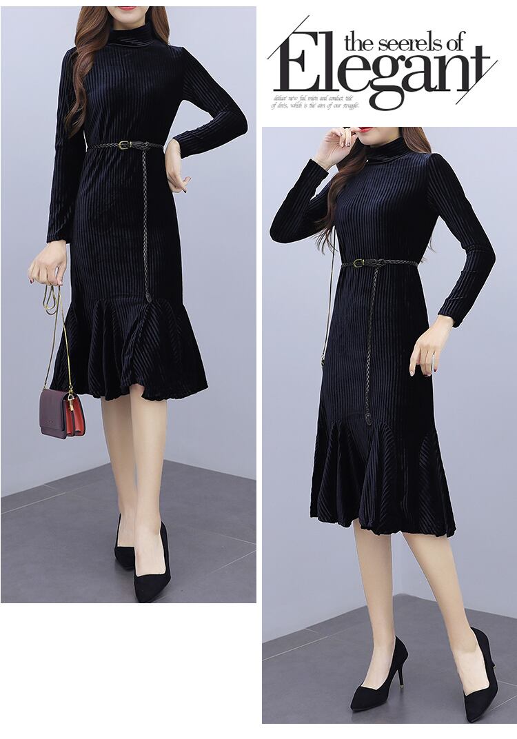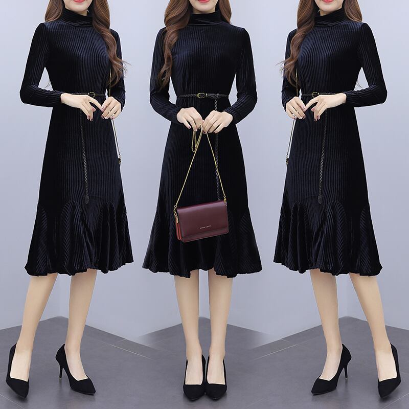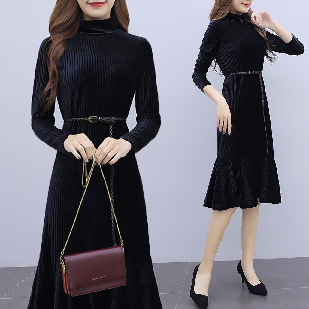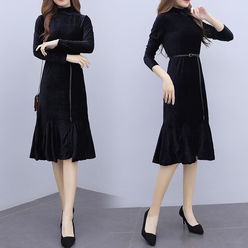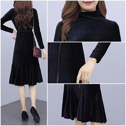 ワンピース ベルベット マーメイド 光沢 ひざ丈 長袖 フリル フレア ハイネック 上品 大人 可愛い トレンド 秋 冬 デート