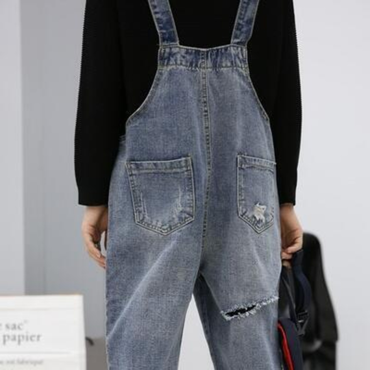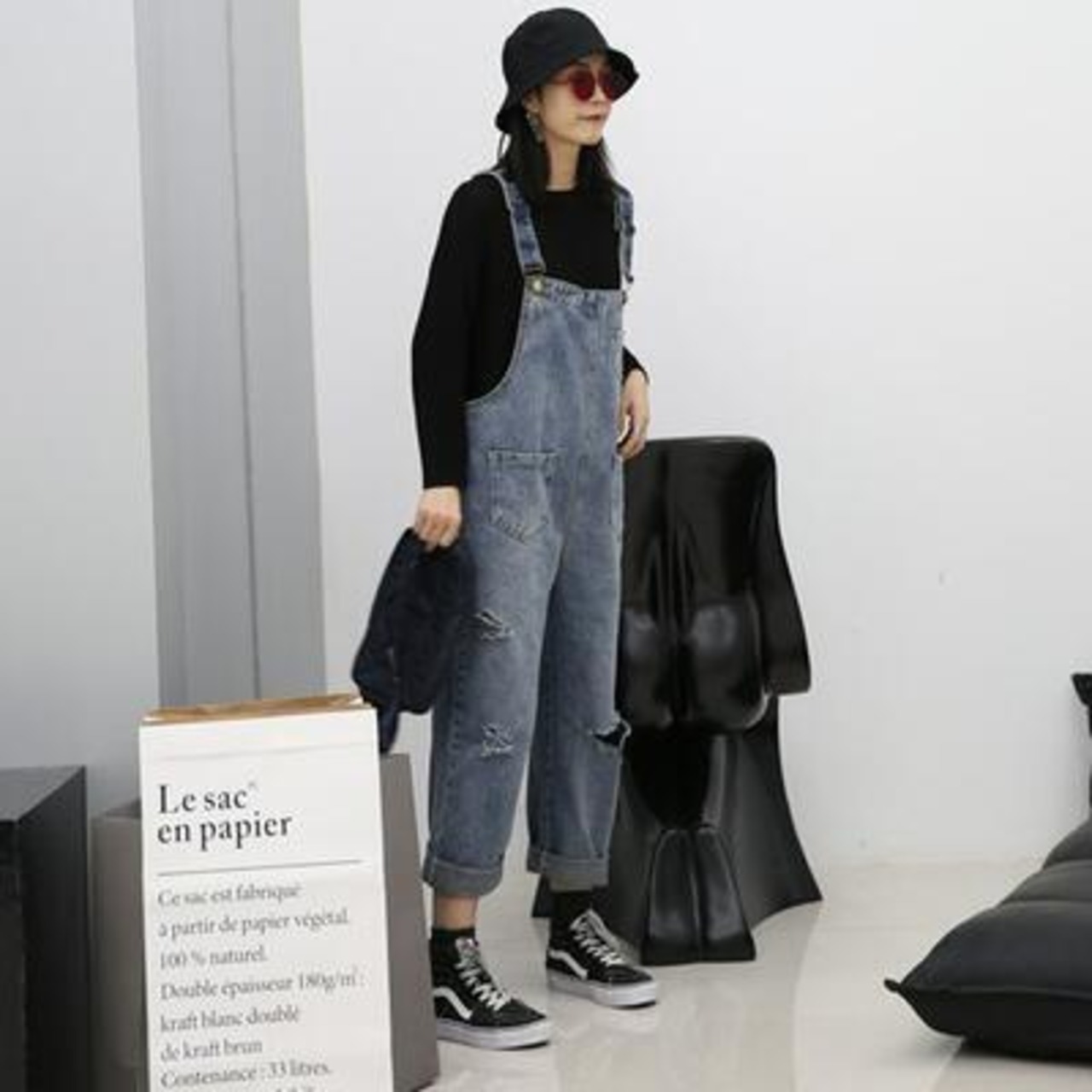オールインワン レディース サロペット パンツ 秋冬 おしゃれ ジャンプスーツ デニム オーバーオール 大きいサイズ ワイドパンツ ダメージ こなれ感 レトロ 定番 可愛い 体型カバー ロング丈 9分丈 ライトブルー XL 2XL 3XL 4XL 20代 30代 40代