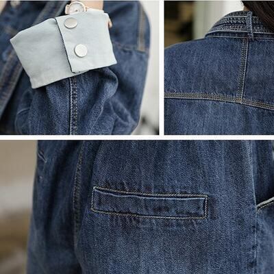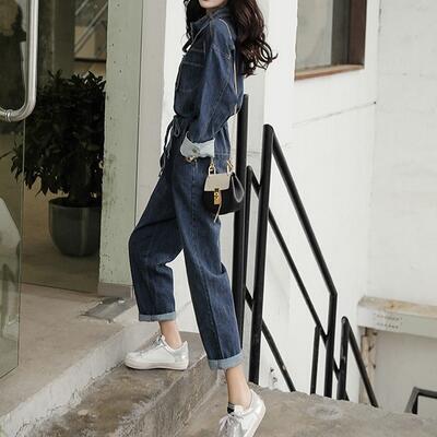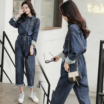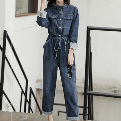 オールインワン レディース サロペット パンツ 秋冬 おしゃれ ジャンプスーツ デニム 長袖 スタンドカラー フロントボタン ウエストリボン ワイドパンツ 9分丈 カジュアル お出かけ デート 普段着 ブルー 20代 30代 40代 50代