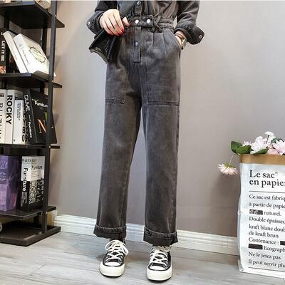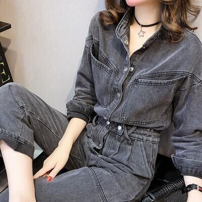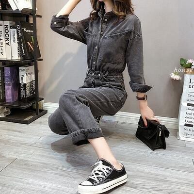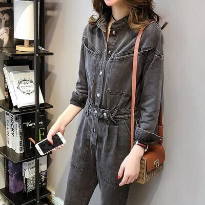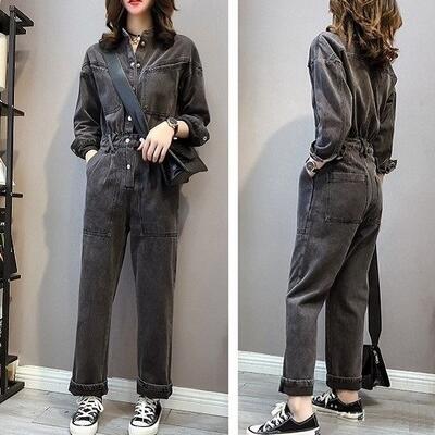 オールインワン レディース サロペット パンツ 秋冬 おしゃれ ジャンプスーツ デニム 長袖 スタンドカラー フロントボタン ストレートパンツ ロング丈 大きいサイズ カジュアル お出かけ デート 普段着 ブラック 黒 XL 20代 30代 40代 50代