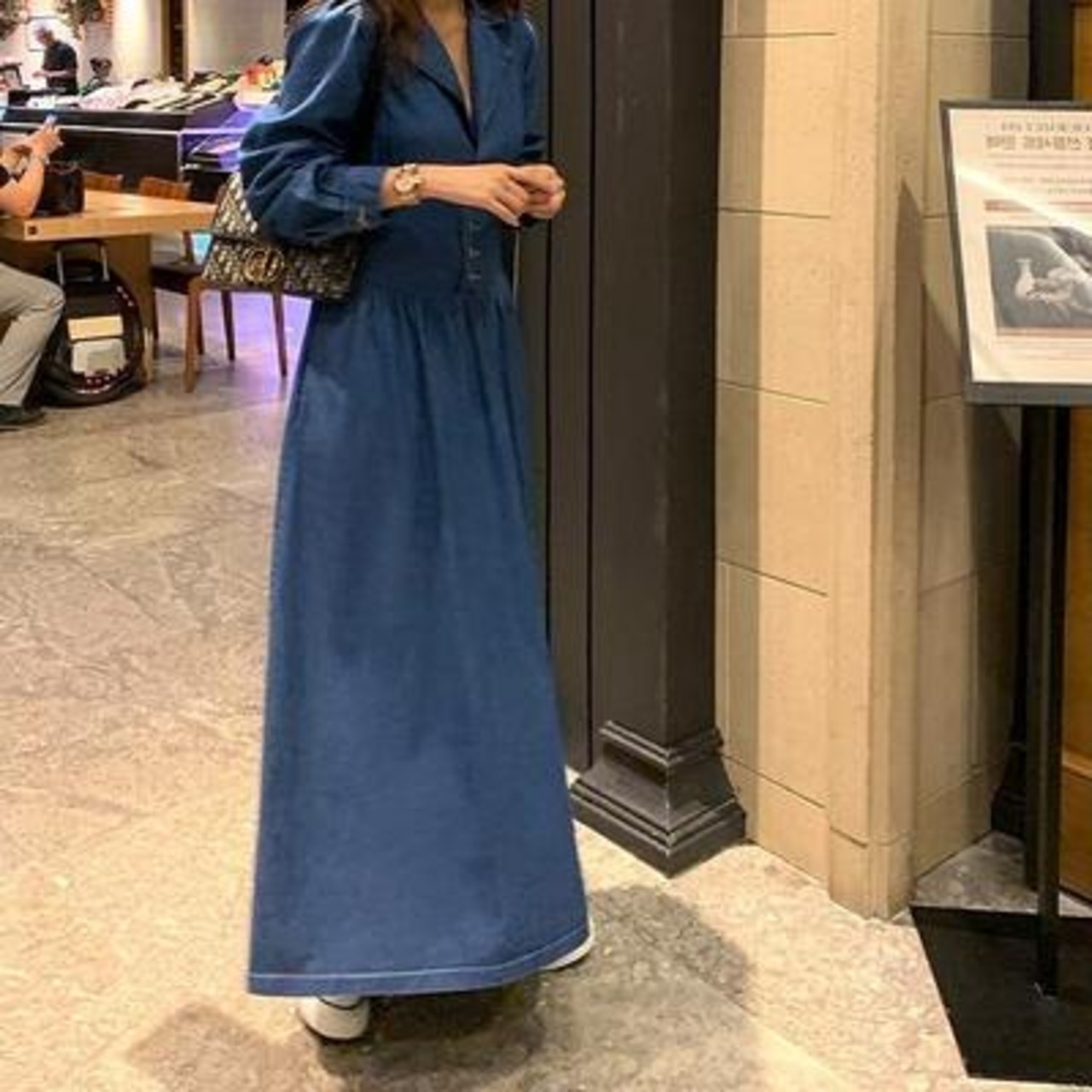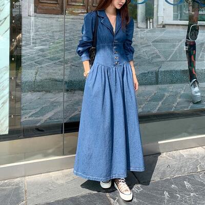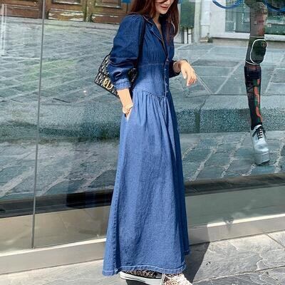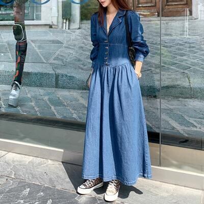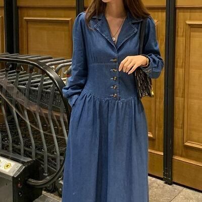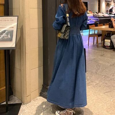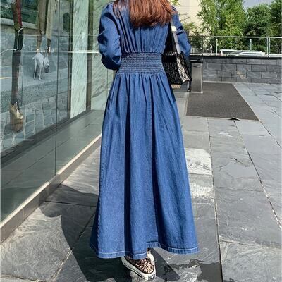 デニムワンピース レディース 秋冬 シャツワンピース Vネック ロング丈 長袖 フレアスカート ハイウエスト パフスリーブ カジュアル 普段着 リゾート ブルー 20代 30代 40代 50代