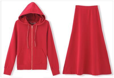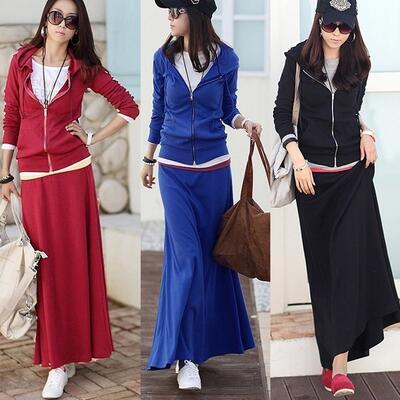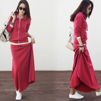 全3色 セットアップ レディース 秋冬 春 上下セット スウェット 長袖 パーカー フード付き ファスナー ロングスカート ミモレ丈 ゆったり カジュアル 部屋着 リゾート 大きいサイズ レッド 赤 ブルー ブラック 黒 XL 2XL 20代 30代 40代 50代