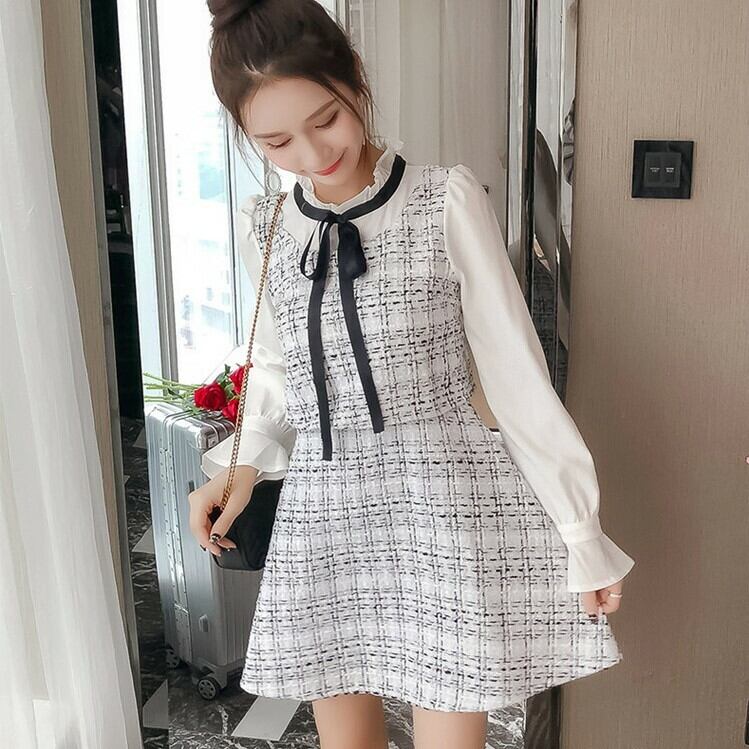 全2色 ワンピース フェイクワンピース ドレス ミニ丈 長袖 レース リボン きれいめ チェック 大人可愛い フェミニン お呼ばれ お出かけ デート パーティ ホワイト ブラック 秋冬