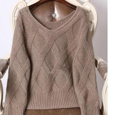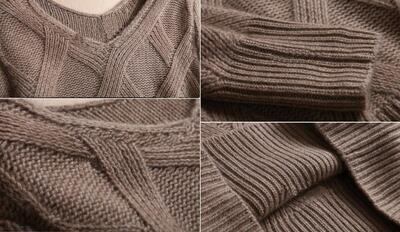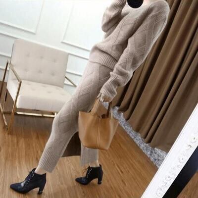 ゆったりとリラックス感のあるVネックセーターとニットスカートのセットアップ。