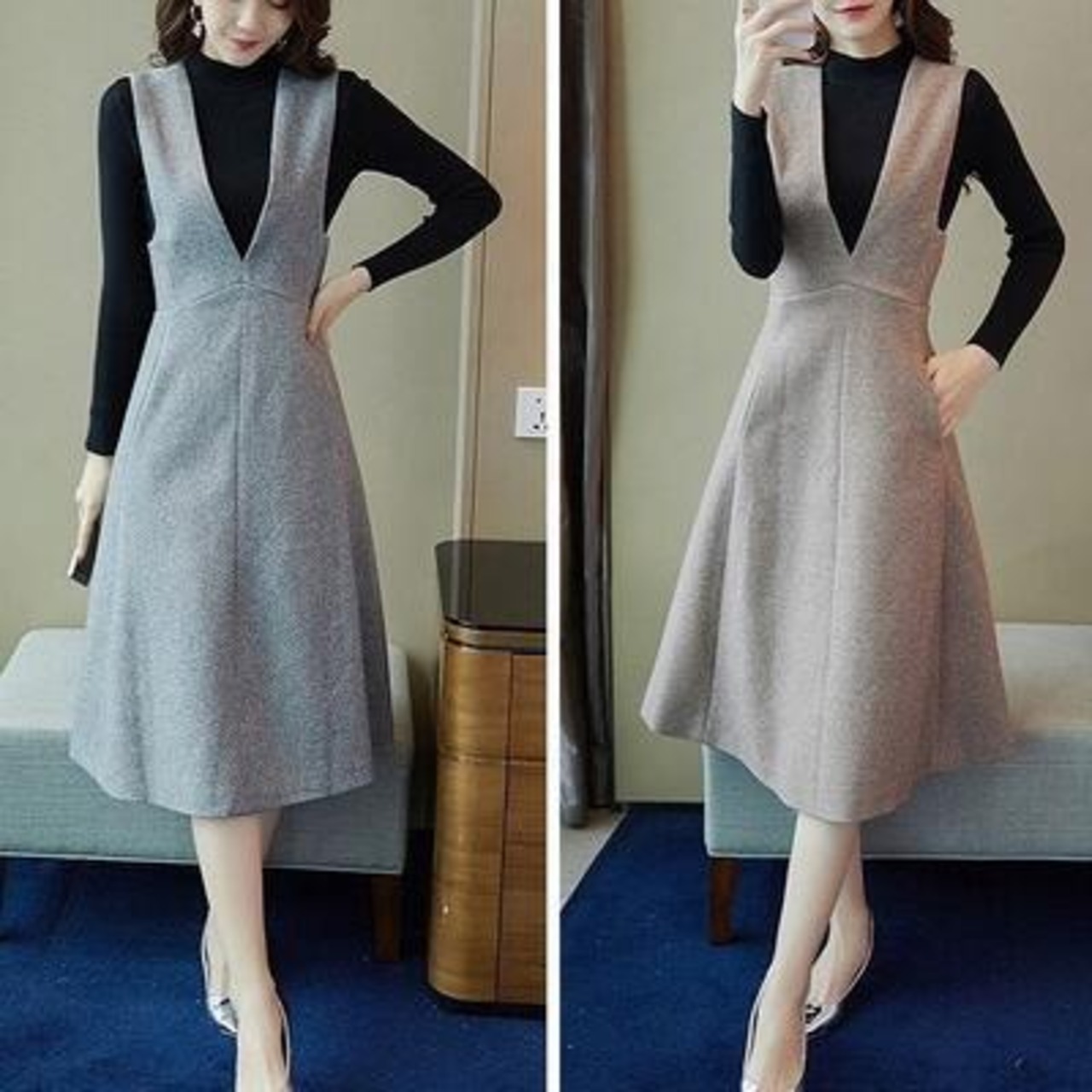 全2色 オールインワン レディース サロペット 秋冬 大きいサイズ ジャンパースカート Vネック ゆったり フレアスカート Aライン ひざ丈 ミディ丈 きれいめ 女子会 カジュアル オフィス 普段着 カーキ グレー XL 20代 30代 40代 50代