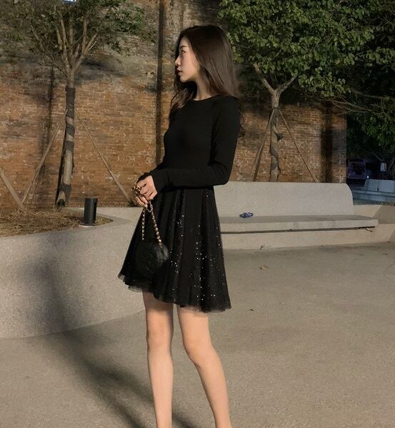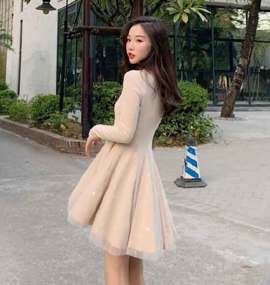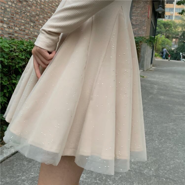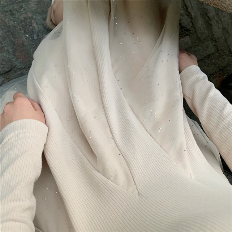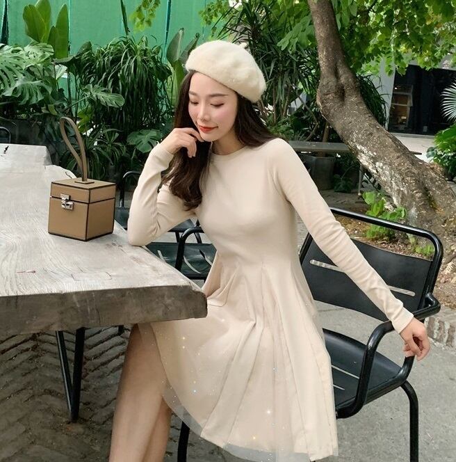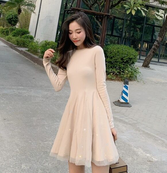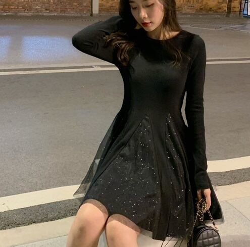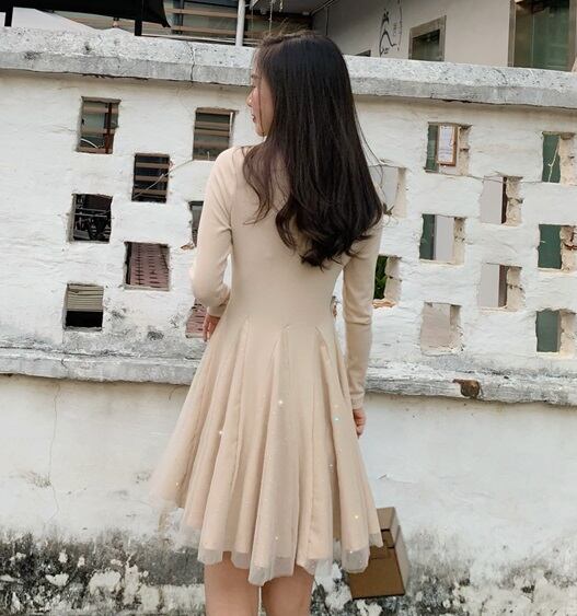 全2色 ワンピース ニット レディース ひざ丈 可愛い 清楚系 華やか デート お食事会 女子会 記念日 キラキラ シフォン スパンコール XL 10代 20代 春 秋 冬