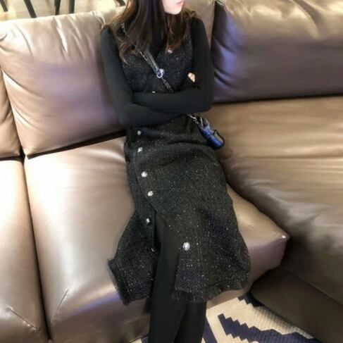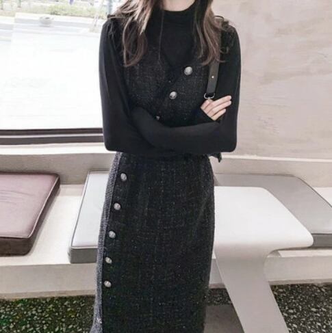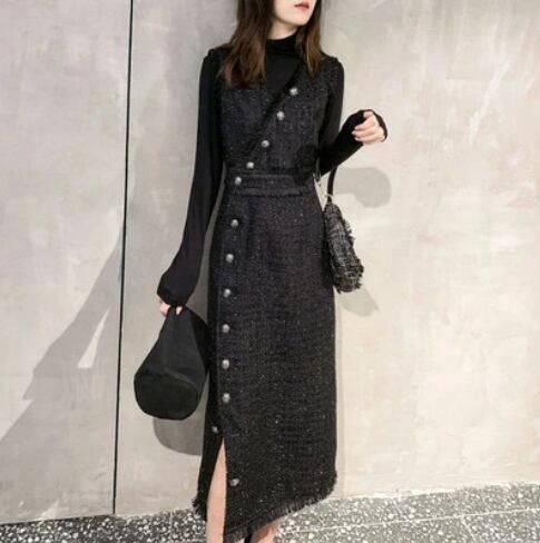 ワンピース レディース 春秋 長袖 カジュアル きれいめ おしゃれ サロペットスカート ハイネック ロング丈 ひざ下丈 長め 大人 Iライン キレイめ シンプル かっこいい 上品 黒 ブラック フリンジ ミディ丈 スリット 大きいサイズ 秋冬 XL プチ タイト 20代 30代 40代 50代