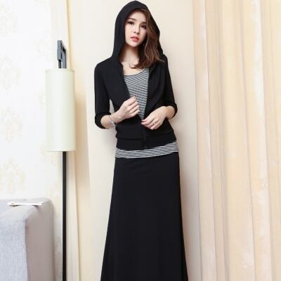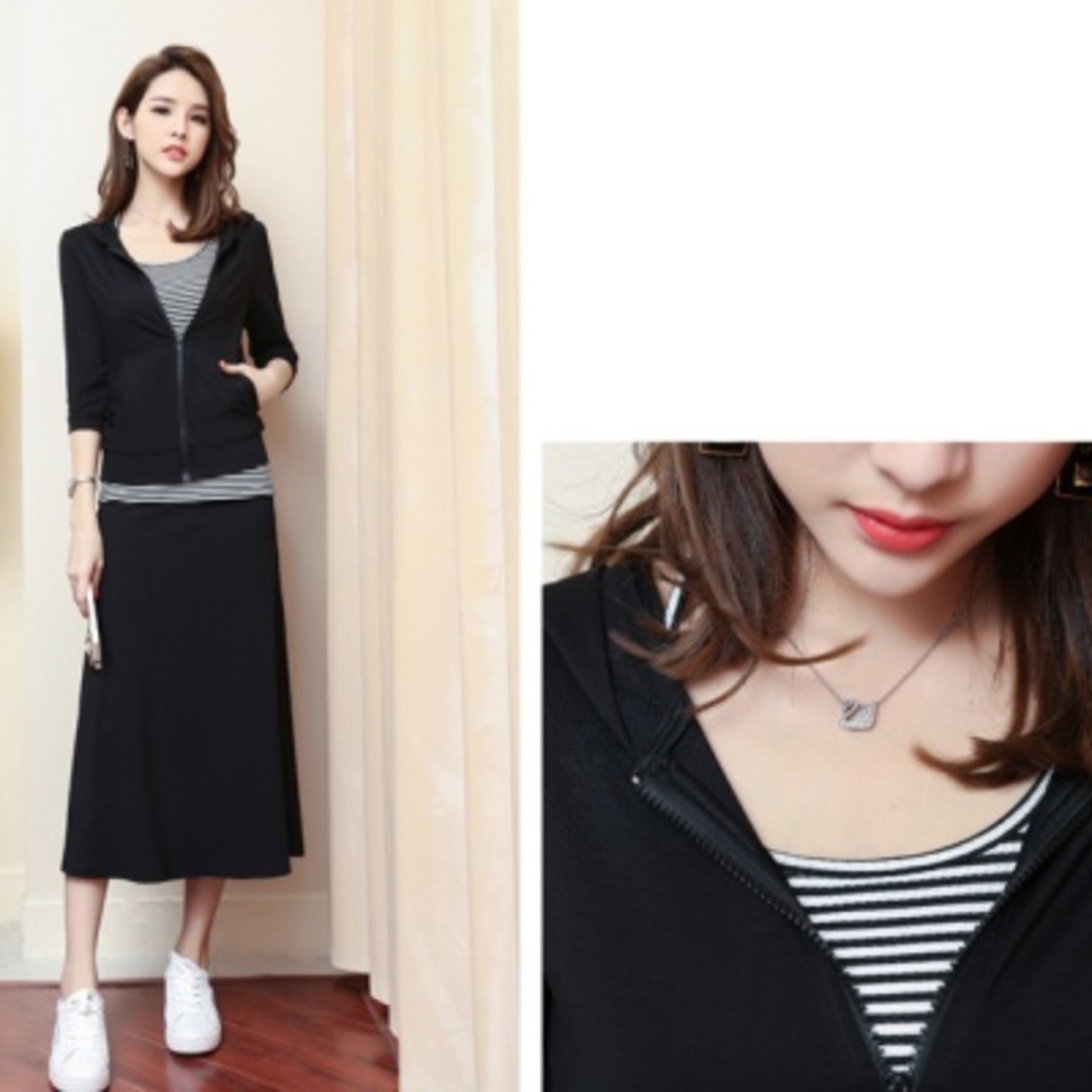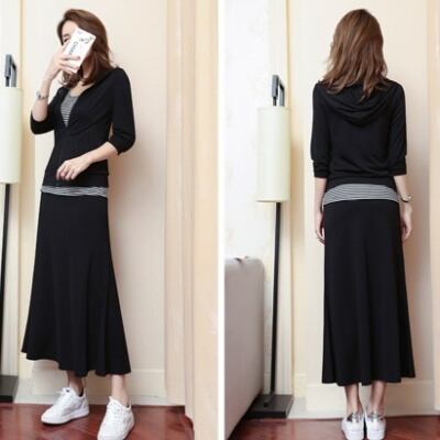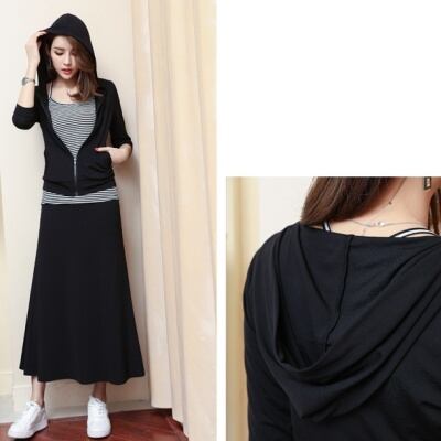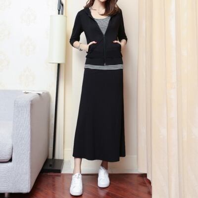 こなれ感のあるデザインのパーカーとインナーとロングスカートの3点セット。