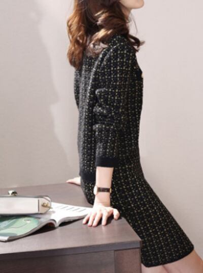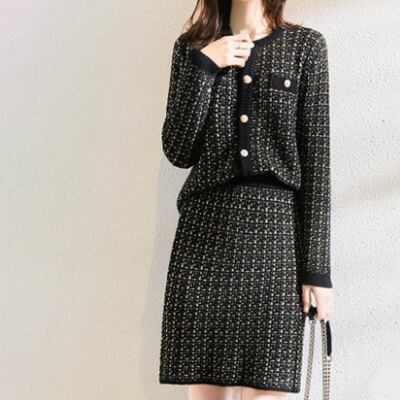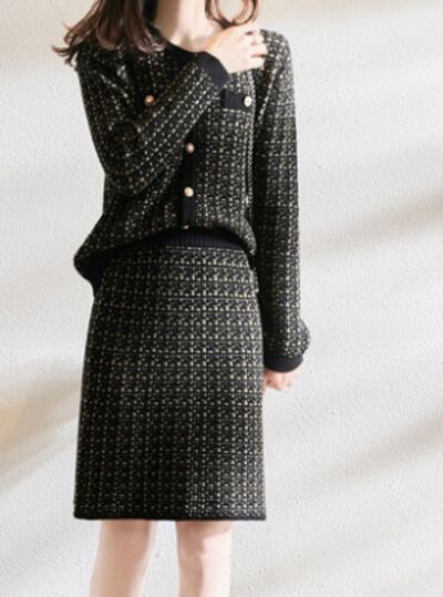 全2色 セットアップ レディース カジュアル きれいめ 袖あり おしゃれ 春 春秋 スカートセット ショート丈 ひざ上丈 ツイード ボタン ラウンドネック 長袖 ニット セーター ホワイト 白 ブラック 黒 20代 30代 40代 50代