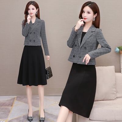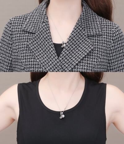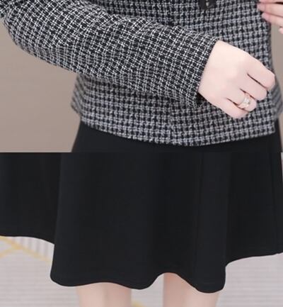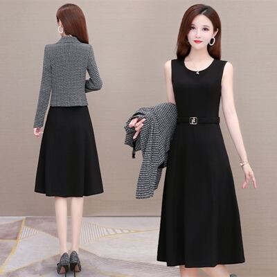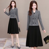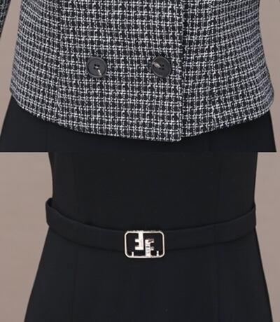 ツイードジャケットとブラックのワンピースがエレガントなセットアップ