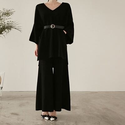 全2色 セットアップ レディース カジュアル きれいめ おしゃれ 春 春秋 パンツセット かっこいい Vネック 7分袖 ゆったり 体型カバー 二の腕カバー 太ももカバー 下半身カバー お腹カバー お尻カバー ブラック 黒 カーキ 大きいサイズ XL 2XL 20代 30代 40代 50代