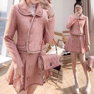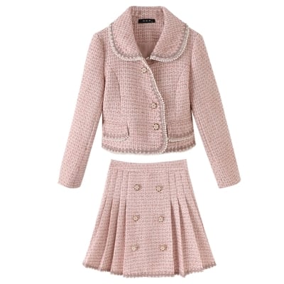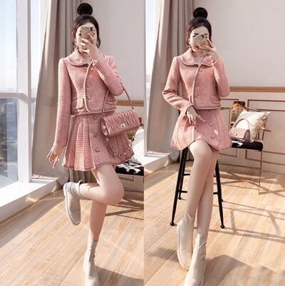 セットアップ レディース カジュアル きれいめ おしゃれ 春 春秋 スカートセット ミニ丈 スリム ツイード プリーツ エレガント ガーリー パーティー Aライン 袖あり 長袖 ボタン チェック パール ガーリー ピンク 大きいサイズ XL 2XL 20代 30代 40代 50代