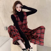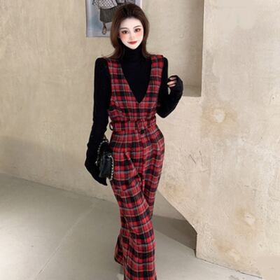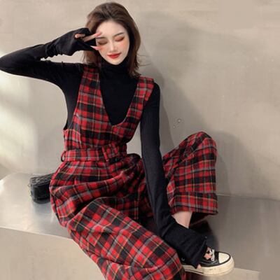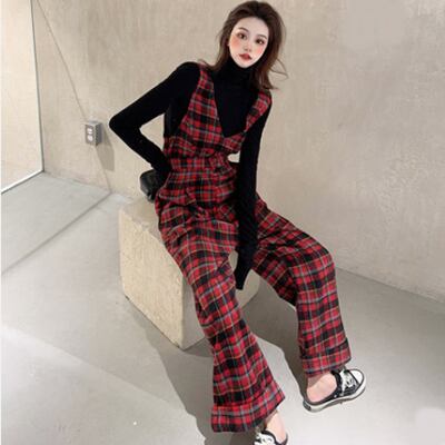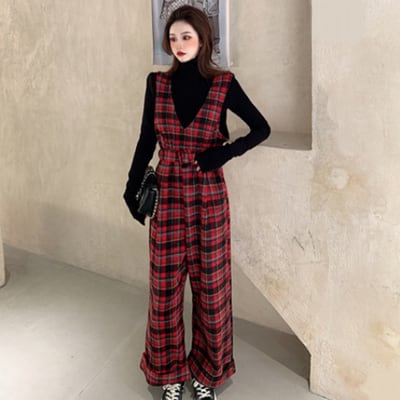 オールインワン パンツ サロペット 春 レディース カジュアル おしゃれ 春秋 春夏 インナーセット チェック 長袖 ノースリーブ Vネック 太ももカバー 下半身カバー お尻カバー レッド 赤 20代 30代 40代 50代