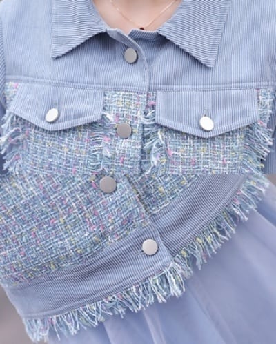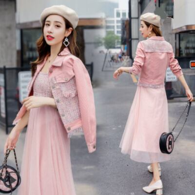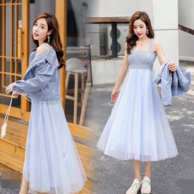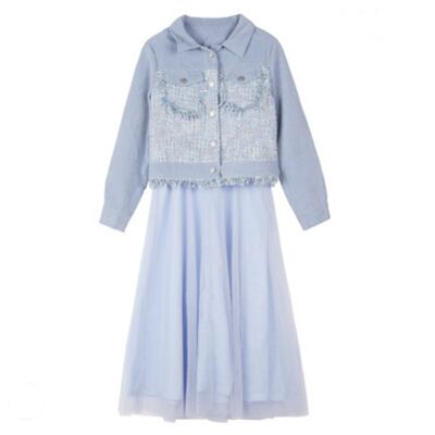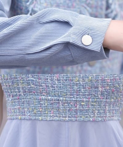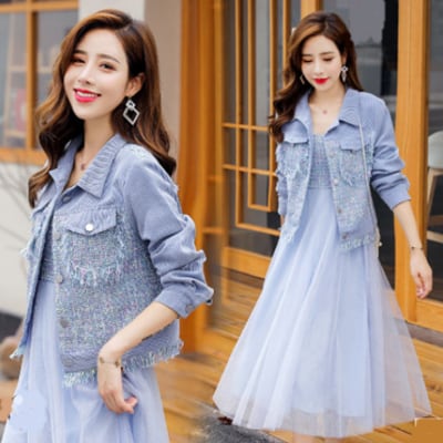 全2色 セットアップ レディース カジュアル きれいめ おしゃれ 春 春秋 ワンピースセット ジャケットセット ミモレ丈 ひざ下丈 チュール Aライン 袖あり 長袖 ガーリー 可愛い ピンク ブルー 青 大きいサイズ XL 20代 30代 40代 50代