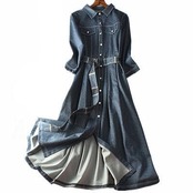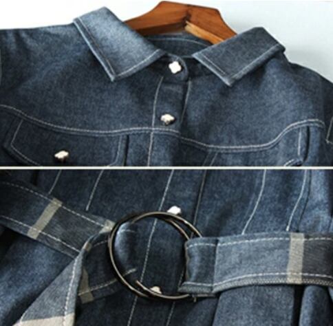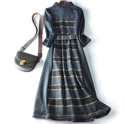 ワンピース 春 きれいめ 袖あり カジュアル おしゃれ レディース 春秋 秋冬 オールシーズン デニム ダンガリー Aライン ドレス ロング丈 マキシ丈 長袖 ウエストベルト チェック お出かけ 大きいサイズ ダークブルー 20代 30代 40代 50代