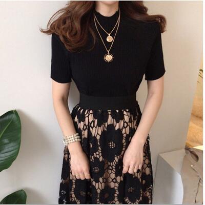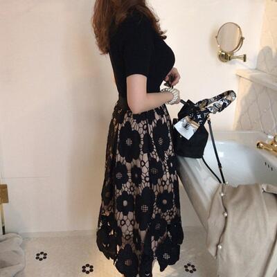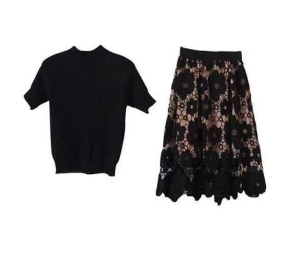 セットアップ レディース エレガント 可愛い おしゃれ 春 春夏 春秋 スカートセット フレアスカート 半袖 ニット カットソー レース ワンピース 着痩せ フェミニン ミモレ丈 小さいサイズ 上下セット きれいめ ブラック 黒 20代 30代 40代 50代