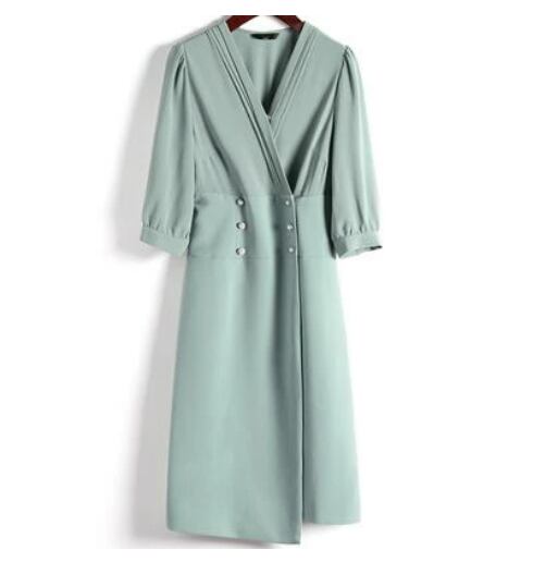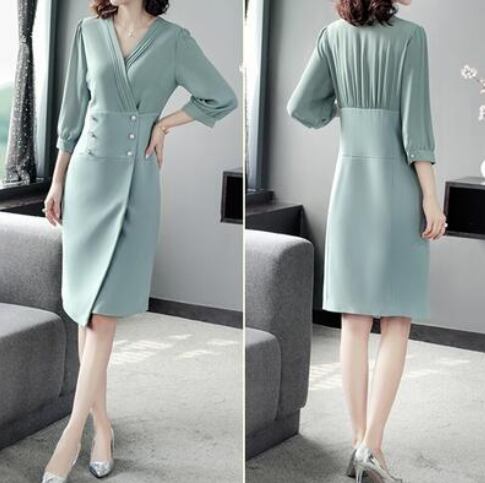 ワンピース 春 きれいめ 七分袖 エレガント おしゃれ レディース 春夏 春秋 クラシカル レトロ パール タイト スリム ドレス ひざ丈 ミモレ丈 ウエストボタン フォーマル フェミニン 着痩せ 大きいサイズ グリーン 緑 20代 30代 40代 50代