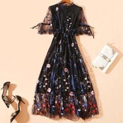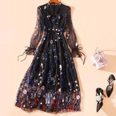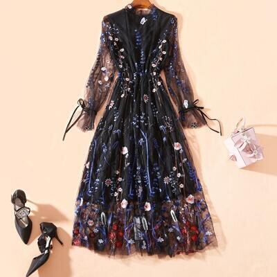 ロマンティックな花柄刺繍を施したロングワンピース。