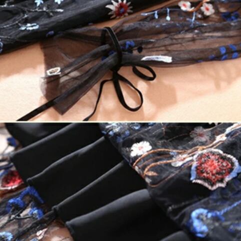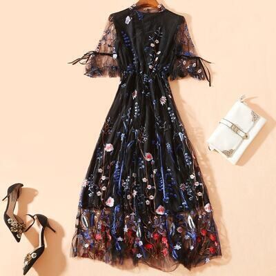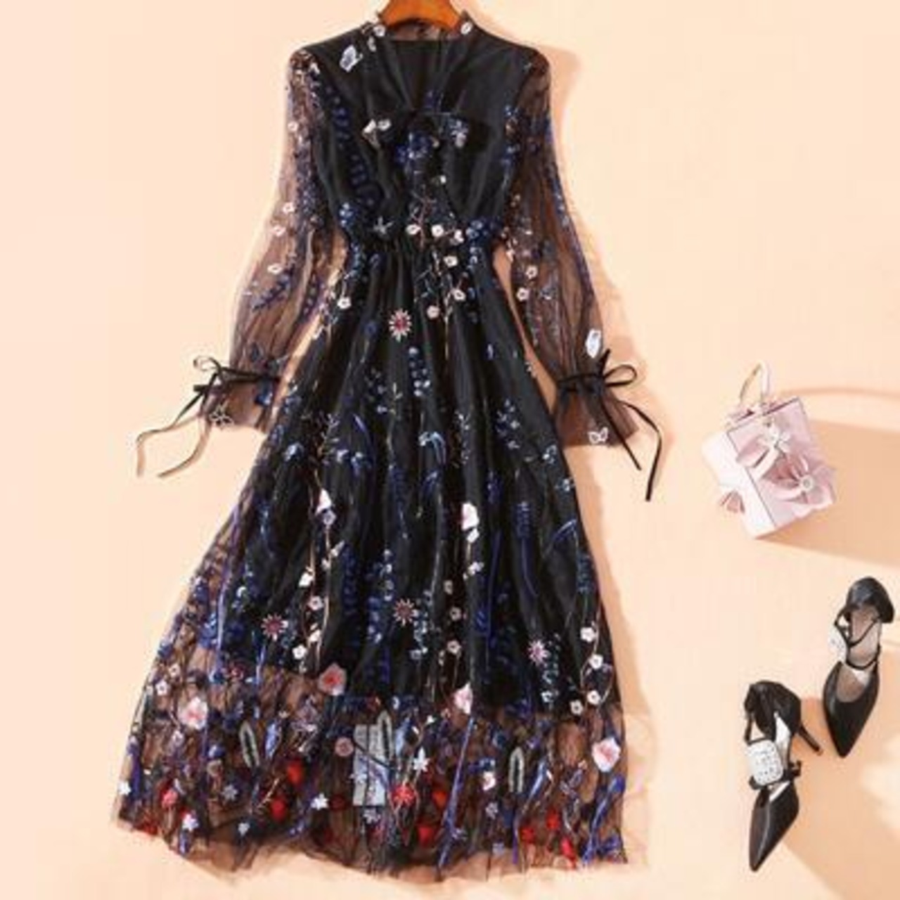 ワンピース 袖あり ロング丈 マキシ丈 カジュアル エレガント 春 春夏 春秋 長袖 半袖 五分袖 おしゃれ レディース 可愛い リボン ワンピ ハイウエスト ドレス Aライン フェミニン 花柄 刺繍 透け感 大きいサイズ ブラック 黒 20代 30代 40代 50代