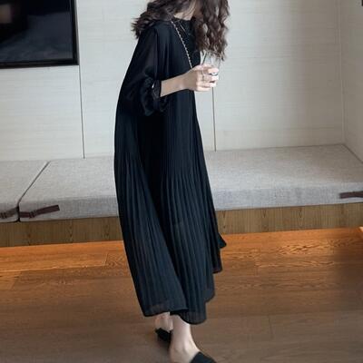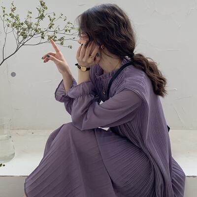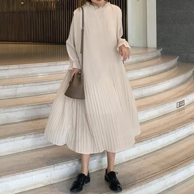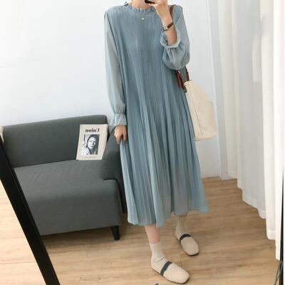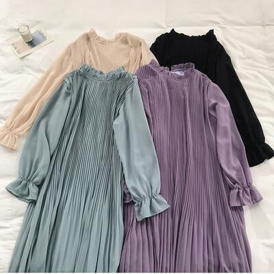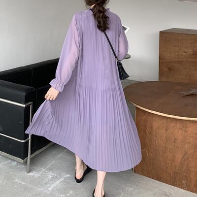 全4色 ワンピース 袖あり ロング丈 マキシ丈 カジュアル 春 春夏 春秋 長袖 おしゃれ レディース 可愛い プリーツ シフォン ワンピ ドレス ゆったり Aライン フェミニン 透け感 大きいサイズ パープル アプリコット ブルー ブラック 黒 20代 30代 40代 50代