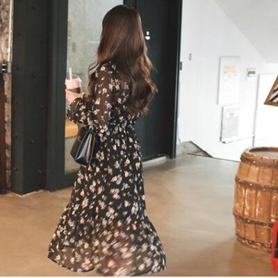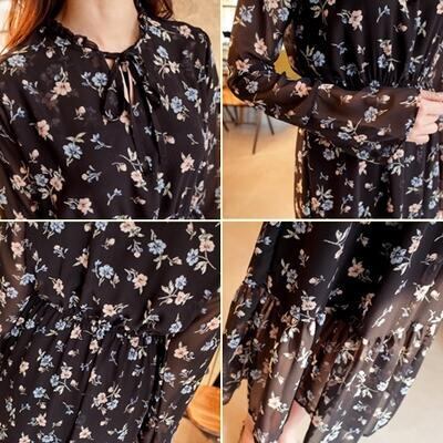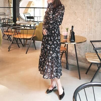 ワンピース 袖あり ロング丈 ミモレ丈 カジュアル 春 春夏 春秋 長袖 おしゃれ レディース 可愛い クラシカル ティアード ウエストゴム 花柄 シフォン ワンピ ドレス ゆったり 透け感 大きいサイズ ブラック 黒 20代 30代 40代 50代