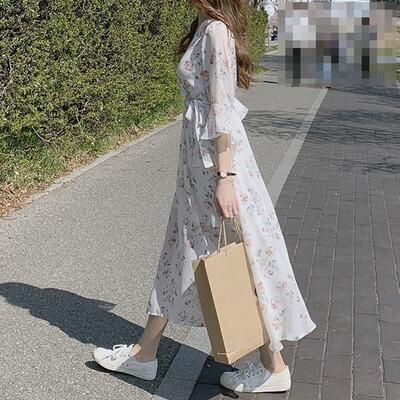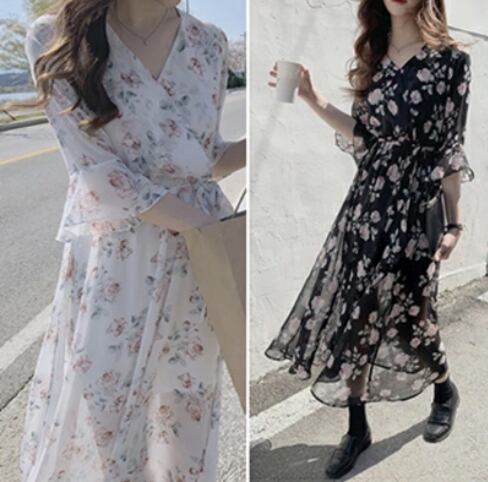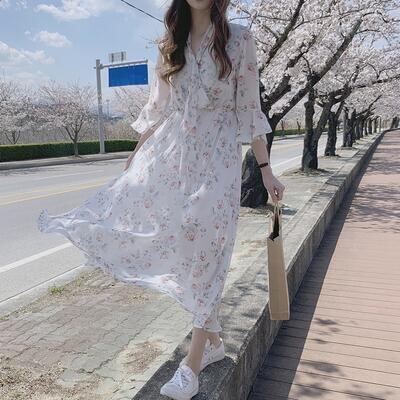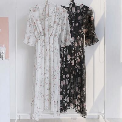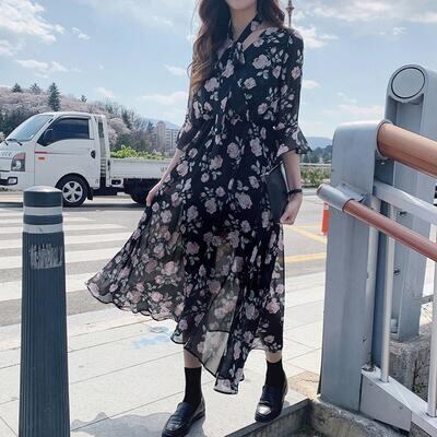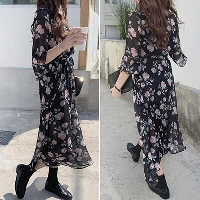 全2色 ワンピース 袖あり ロング丈 マキシ丈 カジュアル 春 春夏 春秋 七分袖 おしゃれ レディース 可愛い クラシカル ヴィンテージ ウエストリボン 花柄 シフォン ワンピ ドレス ゆったり 透け感 大きいサイズ ブラック 黒 ホワイト 白 20代 30代 40代 50代