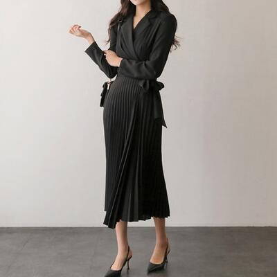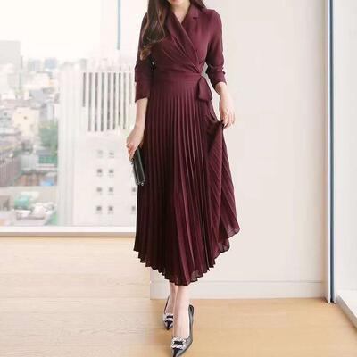全4色 ワンピース おしゃれ 春 きれいめ 袖あり ロング丈 ミモレ丈 エレガント 春夏 春秋 長袖 レディース ワンピ ドレス シフォン プリーツスカート カシュクール オフィス お呼ばれ 大きいサイズ ブラック 黒 ベージュ ブルー 青 ワイン 20代 30代 40代 50代