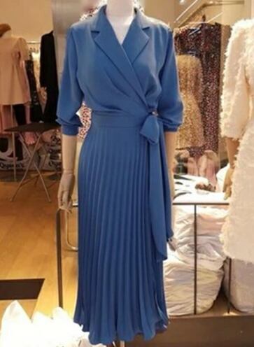 襟付きできちんと感のあるラップタイプのシフォンワンピース。
