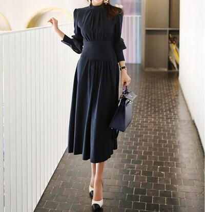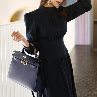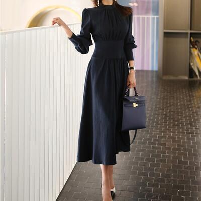ワンピース おしゃれ 春 きれいめ 袖あり ロング丈 ミモレ丈 エレガント 春夏 春秋 長袖 レディース ワンピ ドレス パフスリーブ フレアスカート クラシカル 上品 シンプル オフィス お呼ばれ ネイビー 紺 20代 30代 40代 50代
