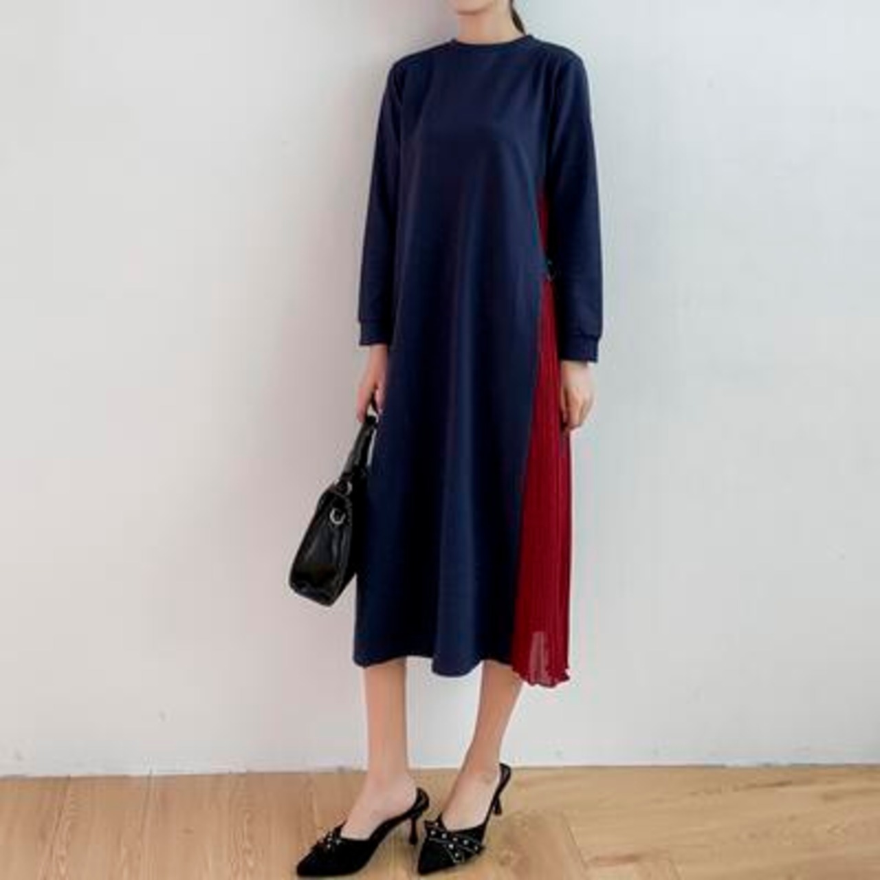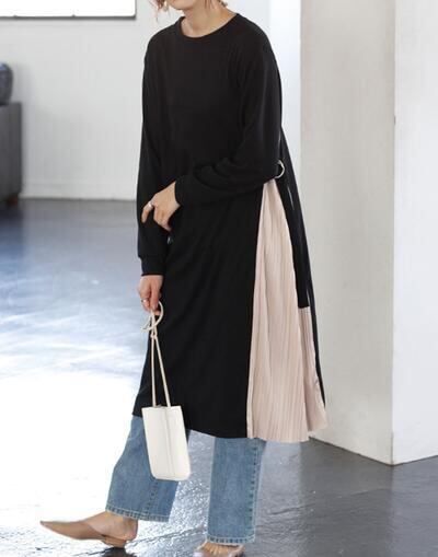 サイドのプリーツがポイントのバイカラーワンピース。