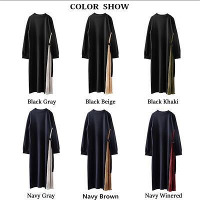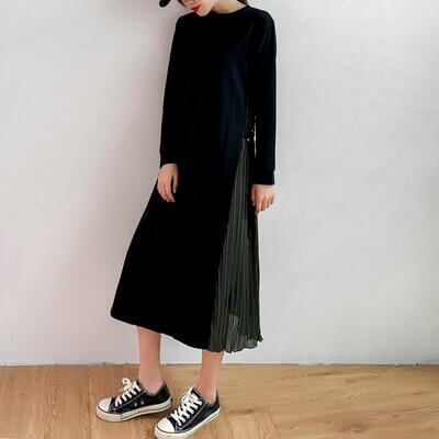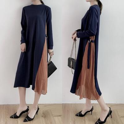 ワンピース おしゃれ 春 きれいめ 袖あり ロング丈 ミモレ丈 エレガント 春夏 春秋 長袖 レディース ワンピ ドレス シフォン プリーツスカート バイカラー レイヤード オフィス キレカジ ゆったり ブラック 黒 ネイビー 紺 20代 30代 40代 50代