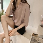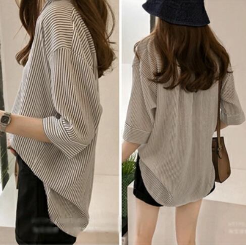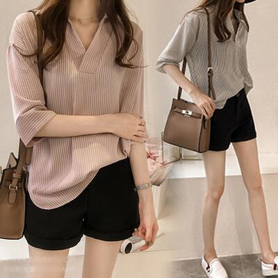 全3色 トップス レディース 袖あり ブラウス エレガント シャツ おしゃれ 春 春夏 春秋 可愛い きれいめ 7部袖 半袖 Vネック 襟付き 開衿 通勤 お出かけ ストライプ ゆったり 大きいサイズ ブルー 青 ピンク ホワイト 白 20代 30代 40代 50代