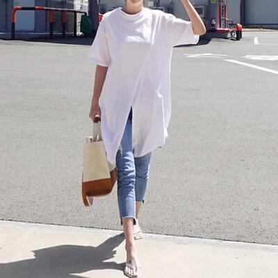 トップス レディース 袖あり Tシャツ カジュアル おしゃれ 春 春夏 春秋 可愛い 半袖 ビッグTシャツ クルーネック チュニック ワンピ シンプル お出かけ ゆったり 体型カバー お尻カバー ホワイト 白 ブラック 黒 20代 30代 40代 50代