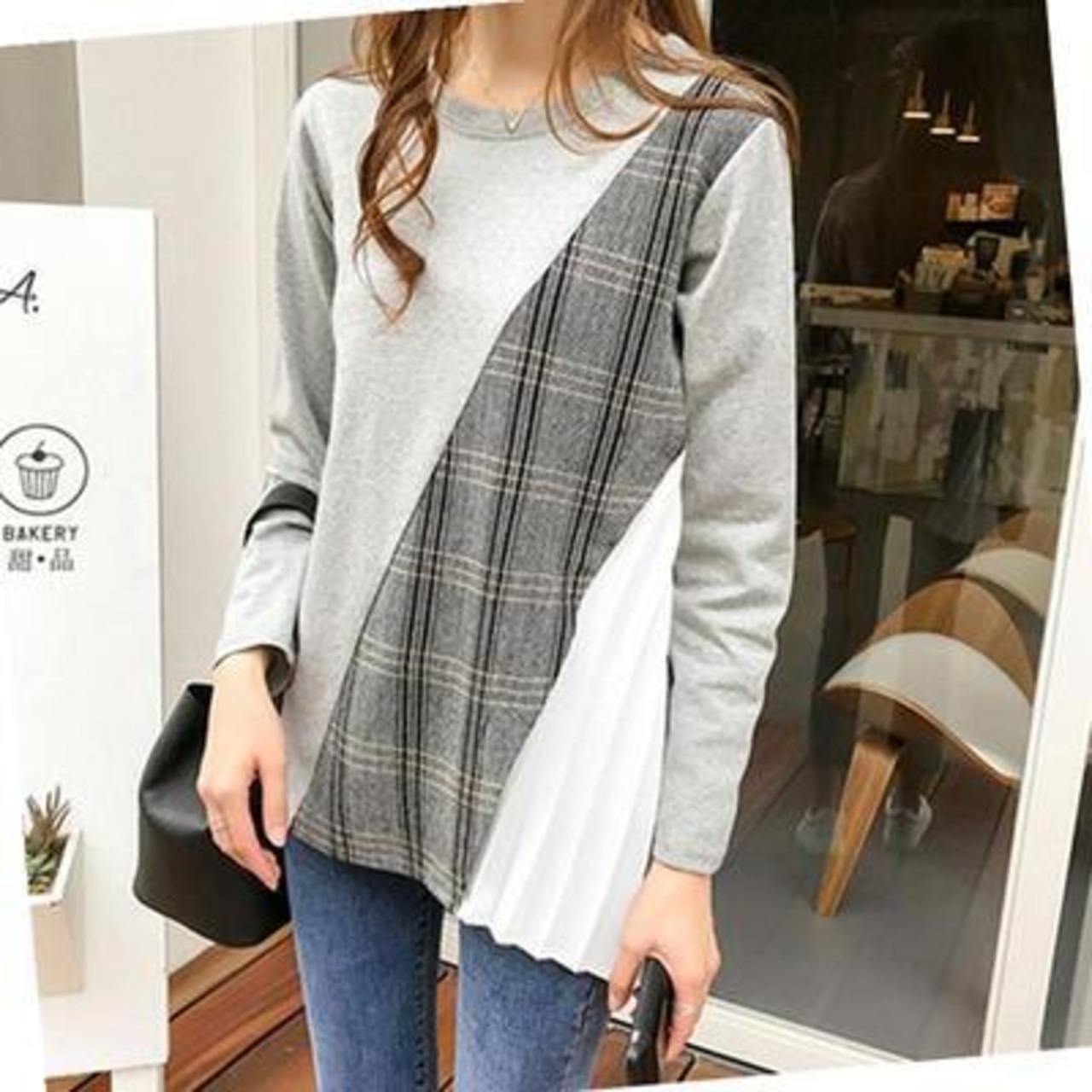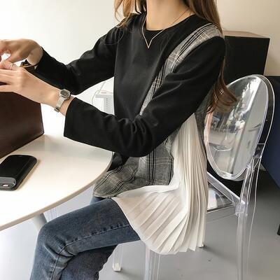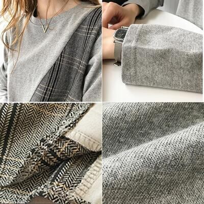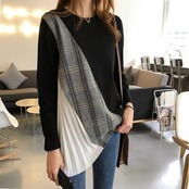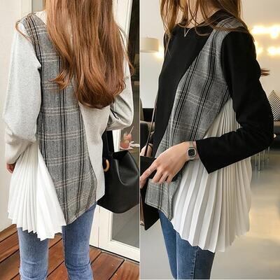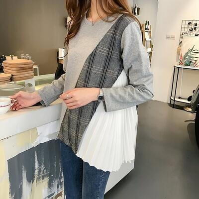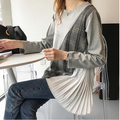 全2色 トップス レディース 袖あり カットソー カジュアル おしゃれ 春 春夏 春秋 可愛い 長袖 サイドプリーツ クルーネック チュニック チェック お出かけ ゆったり 体型カバー 大きいサイズ グレー ブラック 黒 20代 30代 40代 50代