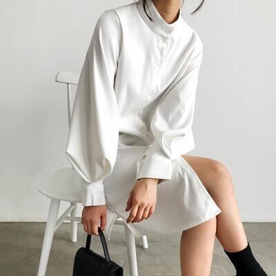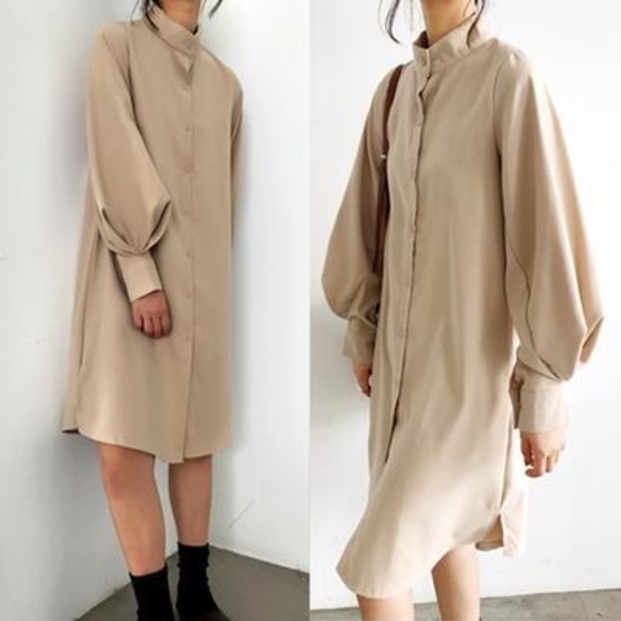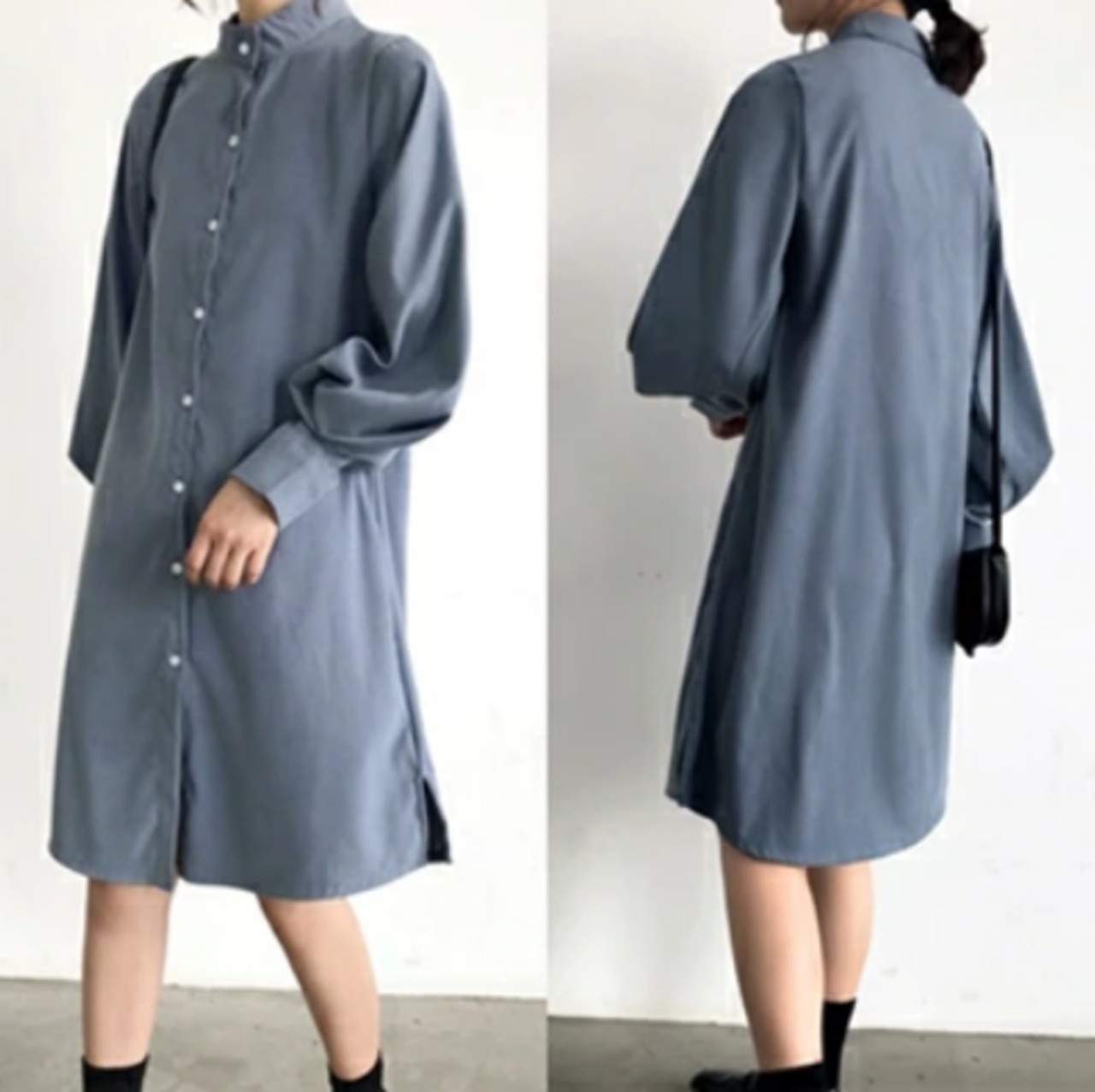 カジュアルになりがちなシャツワンピも、スタンドカラーでモードな印象に。