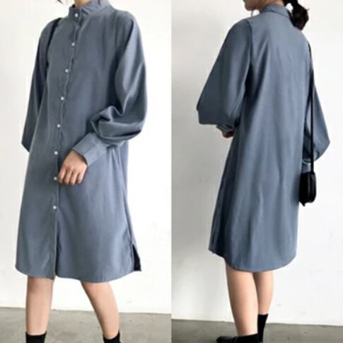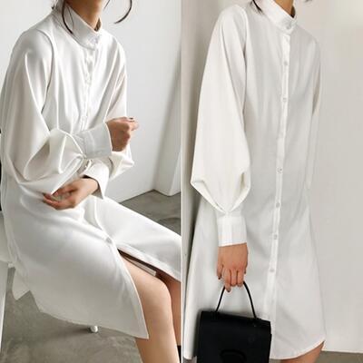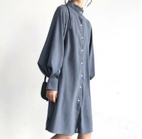 全3色 ワンピース 春 きれいめ 袖あり カジュアル おしゃれ レディース ひざ丈 シャツワンピ ワンピ ドレス チュニック 羽織り 長袖 無地 シンプル 可愛い フェミニン スタンドカラー 体型カバー 春夏 春秋 ホワイト 白 カーキ ブルー 青 20代 30代 40代 50代