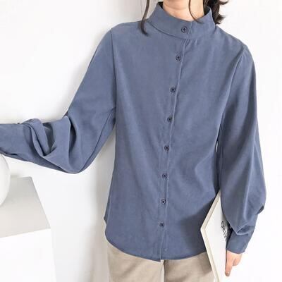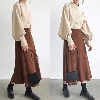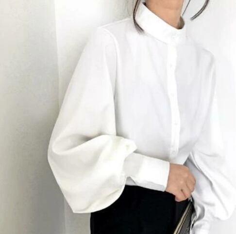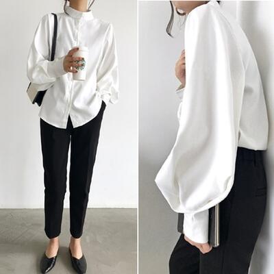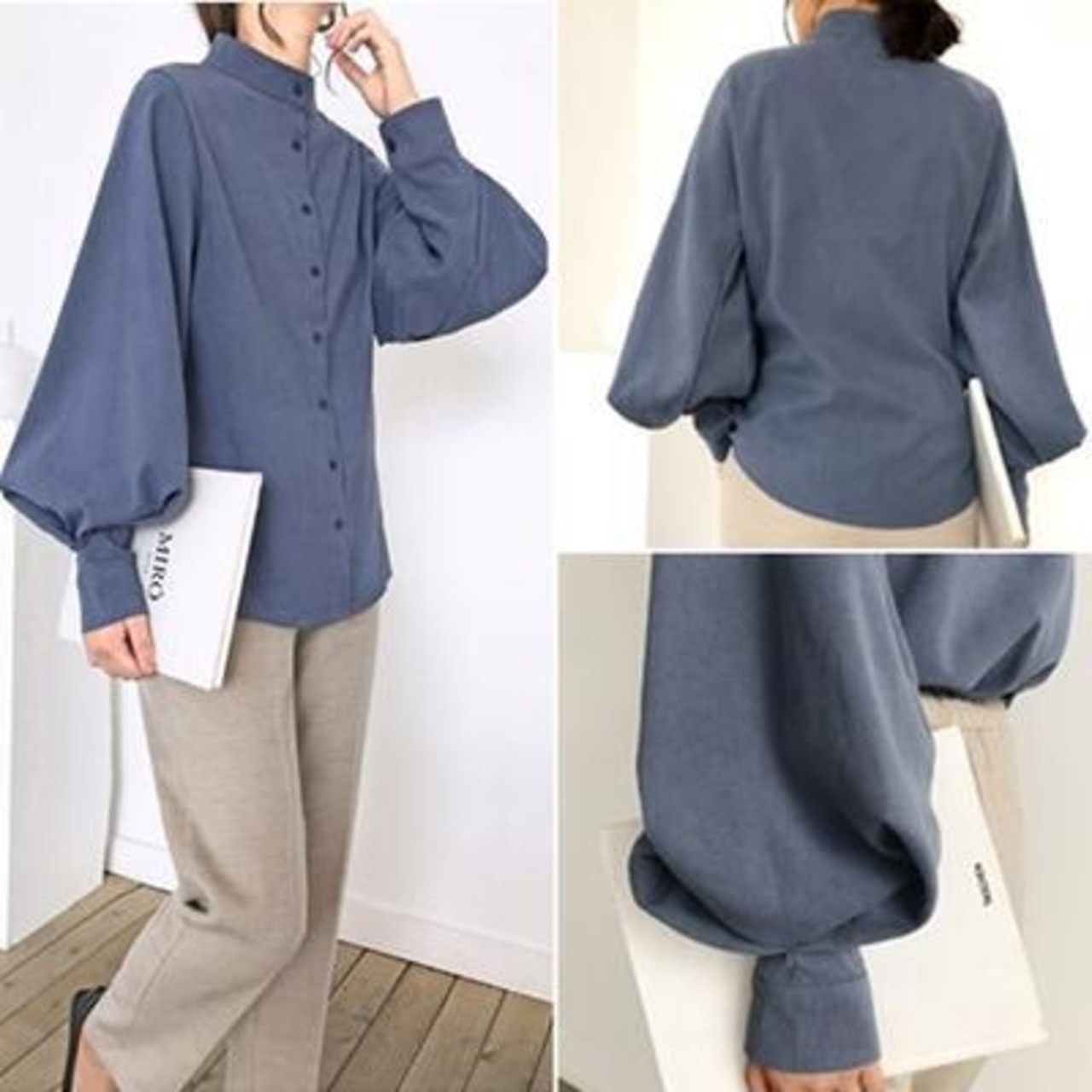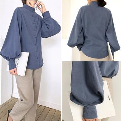 全3色 トップス レディース 袖あり ブラウス きれいめ おしゃれ 春 春夏 春秋 可愛い 長袖 シャツ スタンドカラー バルーン袖 お出かけ オフィスカジュアル フェミニン エレガント クラシック ホワイト 白 カーキ ブルー 青 20代 30代 40代 50代