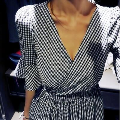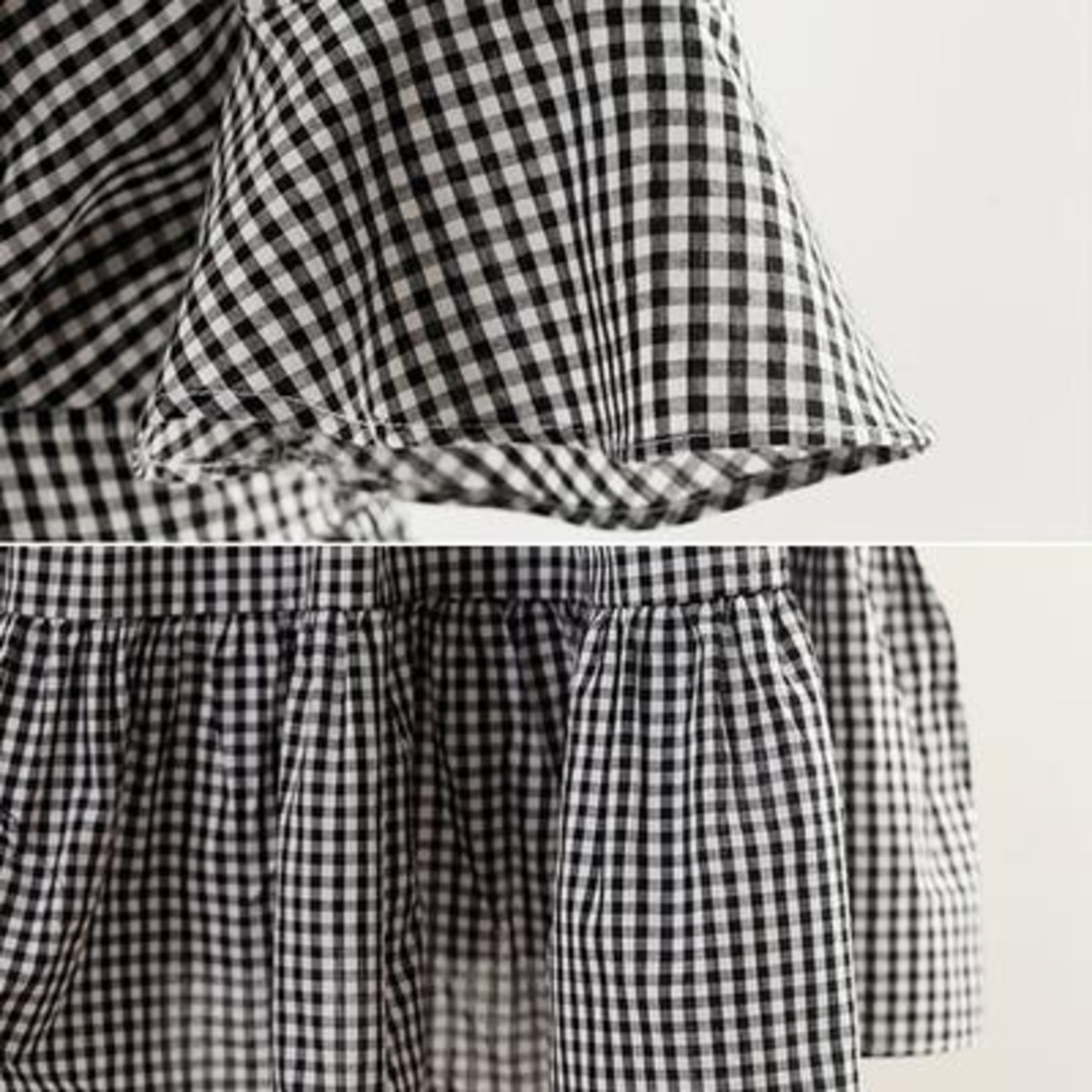 キュートなギンガムチェックも深めのVネックで子供っぽく見せません。