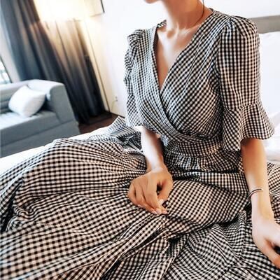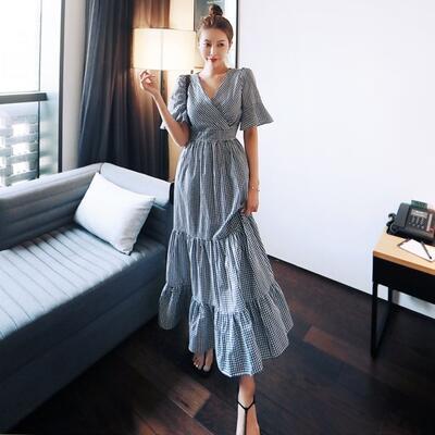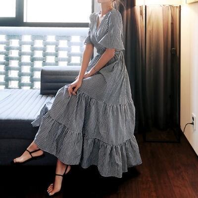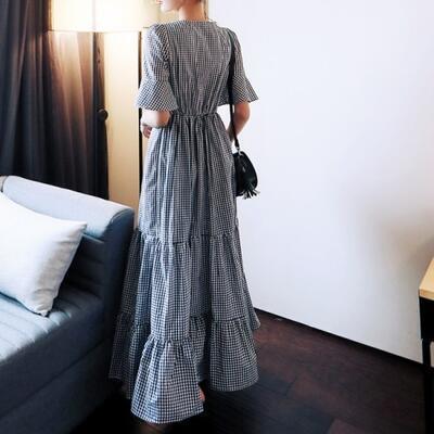 ワンピース 春 きれいめ 袖あり カジュアル おしゃれ レディース ロング丈 マキシ丈 ワンピ ドレス ギンガムチェック Vネック 半袖 可愛い ティアード フェミニン ハイウエスト 春夏 春秋 リゾート 女子会 ブラック 黒 20代 30代 40代 50代