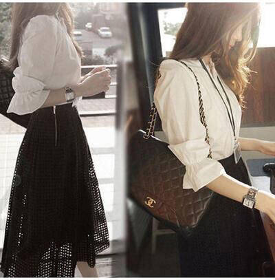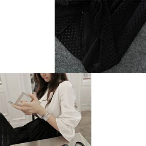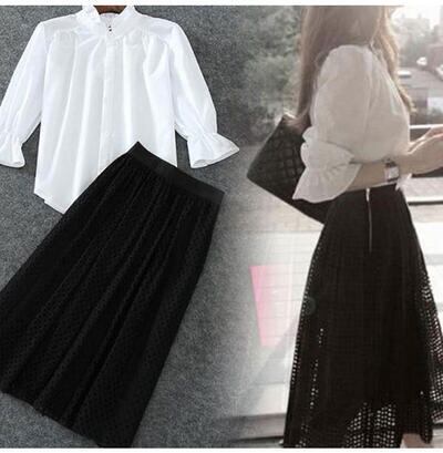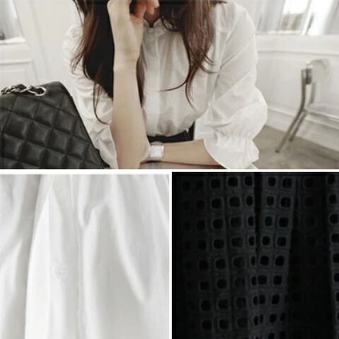 セットアップ レディース 秋 カジュアル おしゃれ 2点セットバイカラー パフスリーブ 5分袖 ひざ丈 ミモレ丈 こなれ感 OL デイリー お出かけ デート シンプルセットアップ シャツ ブラウス ブラック ホワイト 20代 30代 40代 50代