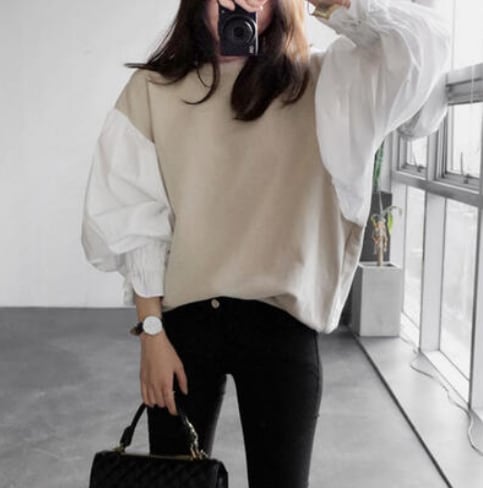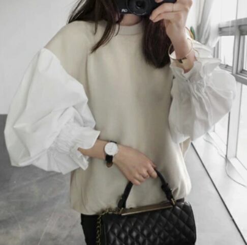 春 トップス レディース 袖あり カジュアル きれいめ おしゃれ セーター こなれ感 ニット バイカラー ラウンドネック パフスリーブ 切替 ボリューム袖 無地 長袖 大きいサイズ ゆったり フェミニン 普段着 ホワイト 白 ベージュ カーキ XL 20代 30代 40代 50代