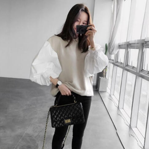 薄手ニットとブラウス生地のコラボがおしゃれなトップス♪