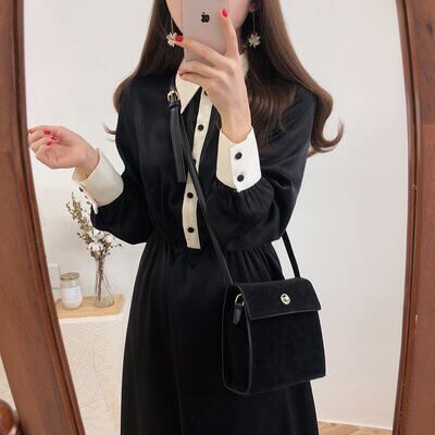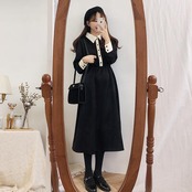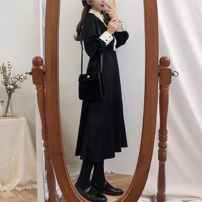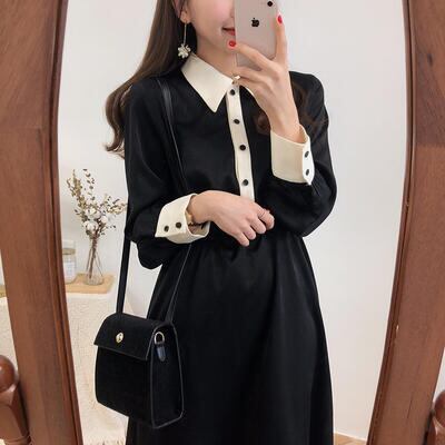 春 きれいめ ワンピース レディース 袖あり カジュアル おしゃれ 大きな襟 レトロ フレア ミモレ丈 ワンピ 上品 エレガント ブラック 大きいサイズ XL 黒 ドレス ひざ下丈 春秋 バイカラー シンプル フェミニン 可愛い ロング丈 20代 30代 40代 50代
