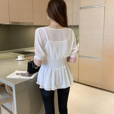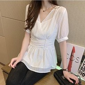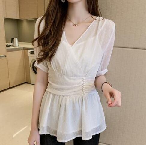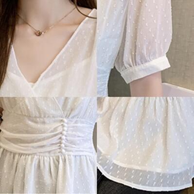 トップス レディース ブラウス エレガント シャツ おしゃれ 春 春夏 春秋 可愛い きれいめ 半袖 Vネック パフスリーブ シフォン プルオーバー 通勤 お出かけ ガーリー フェミニン 大きいサイズ ホワイト 白 20代 30代 40代 50代