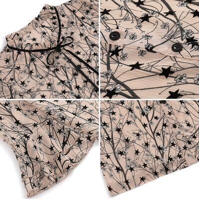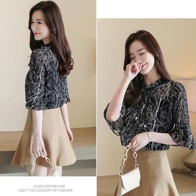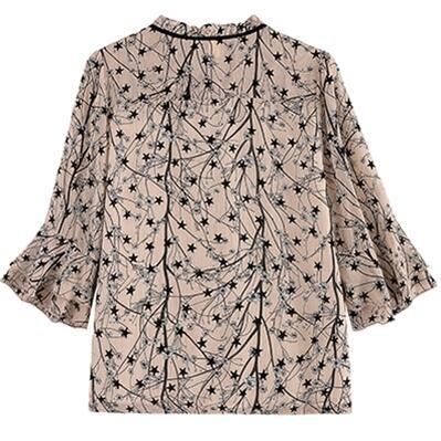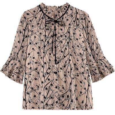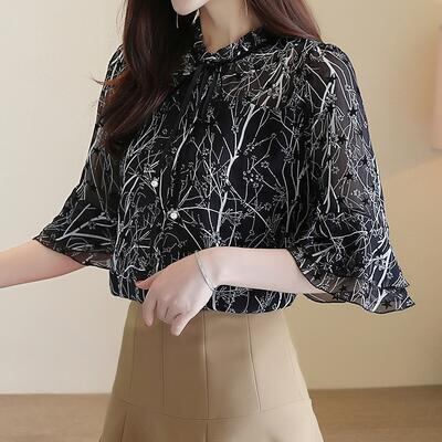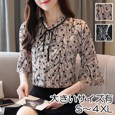全2色 トップス レディース 袖あり ブラウス 7分袖 きれいめ カジュアル おしゃれ 春 春夏 春秋 可愛い シフォン 花柄 フリル フェミニン スタンドカラー リボン クラシカル お出かけ アプリコット ブラック 黒 カーキ 20代 30代 40代 50代