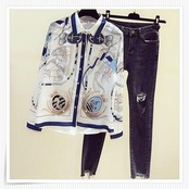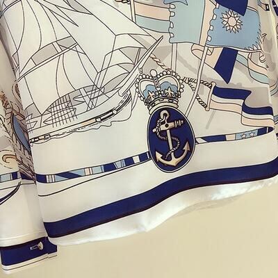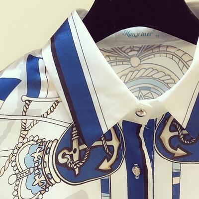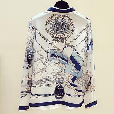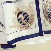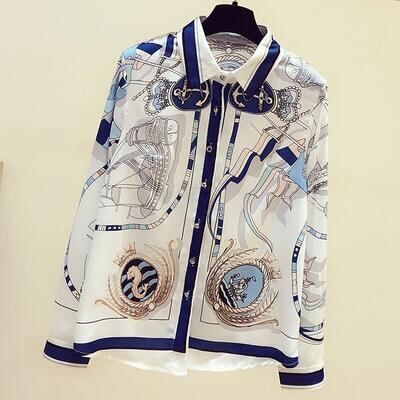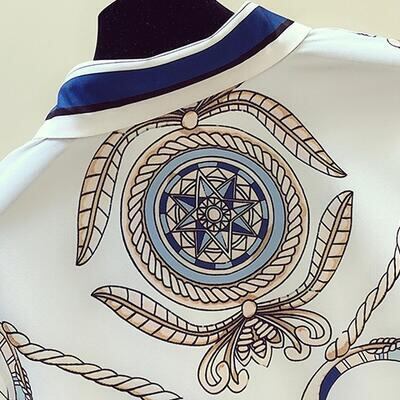 とろみ感のある上品なスカーフ柄ブラウス。