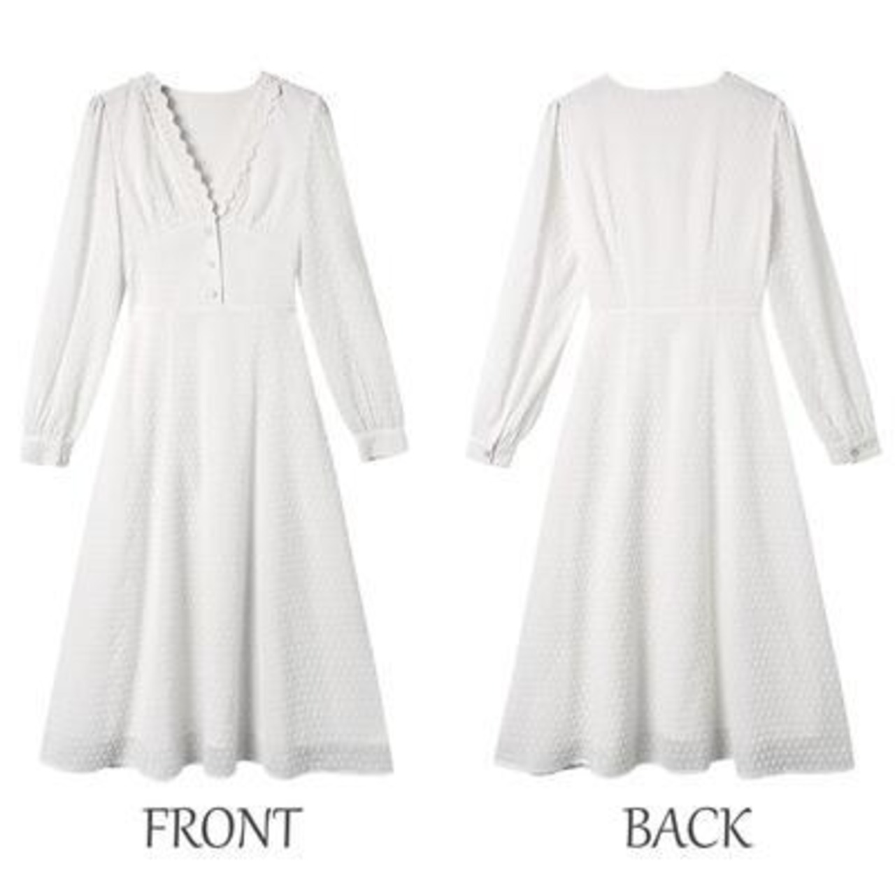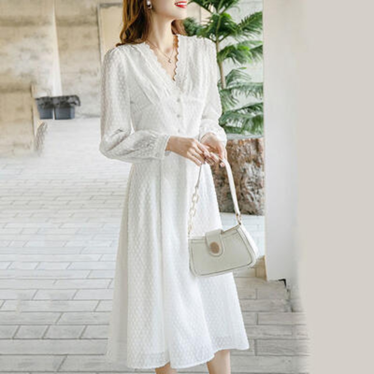ワンピース 春 きれいめ 袖あり カジュアル おしゃれ レディース ミモレ丈 ワンピ ドレス ドット Vネック レース 透け感 長袖 可愛い エレガント ハイウエスト Aライン 春夏 春秋 お出かけ 女子会 ホワイト 白 20代 30代 40代 50代